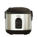 7-cup rice cooker with auto cook/warm function, non-stick removable bowl, locking lid, and steaming tray for vegetables and fish.